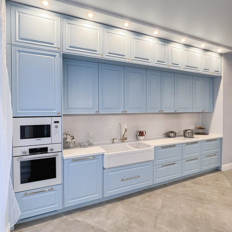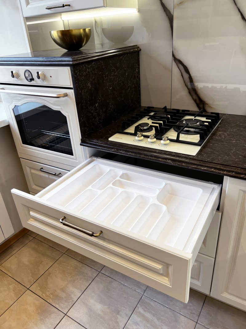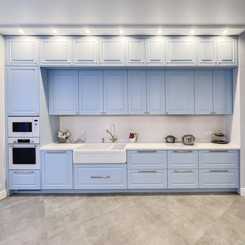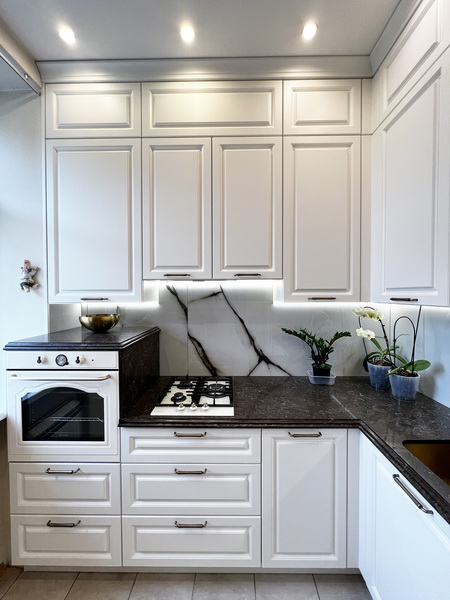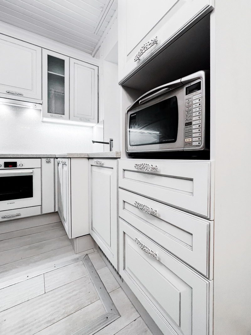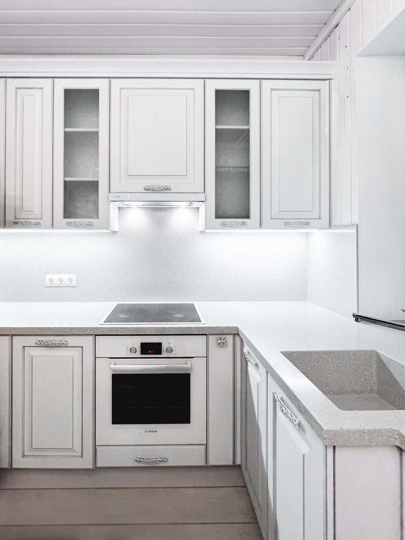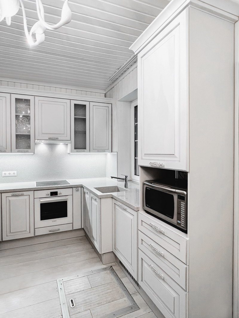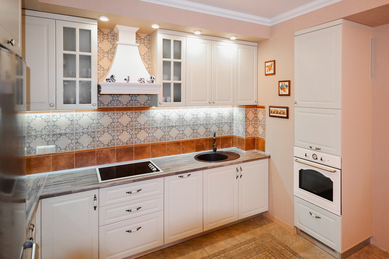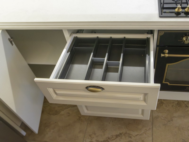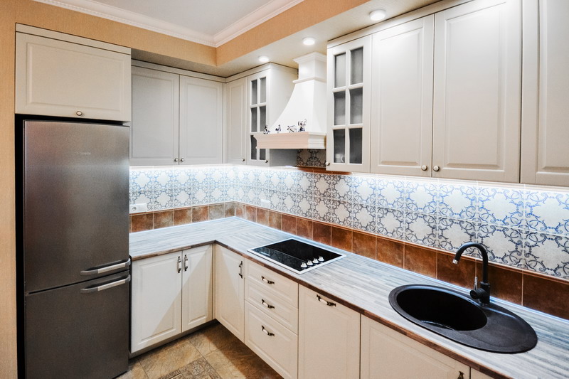 В настоящее время для изготовления кухни используют материал – для корпуса ЛДСП (Ламинированная Древесно-Стружечная Плита) разного формата и толщины, например: 16, 22, 25 мм. Так же возможны комбинации по сращиванию разных толщин и облицовка торца изделия кромкой от 0,4 до 2 мм. Для корпуса кухни в основном используют материал 16 мм. На фасады кухни применяют различный материал – это могут быть как МДФ покрытое пленкой или шпоном натурального дерева 0,2 мм – используют как для фасадов в классическом стиле (различных форм фрезеровки) так и фасадов для кухонь в современном стиле используя глянцевое и матовое покрытие. Далее алюминий, пластик, стекло матовое и стеснением различных рисунков, тонированное и бесцветное. И конечно фасады из массива различных пород дерева, разной тонировки, эффектами старения. Плюс ко всему грамотно подобранная фурнитура по стилю и функциональности, завершает полную картину Вашей мечты.
