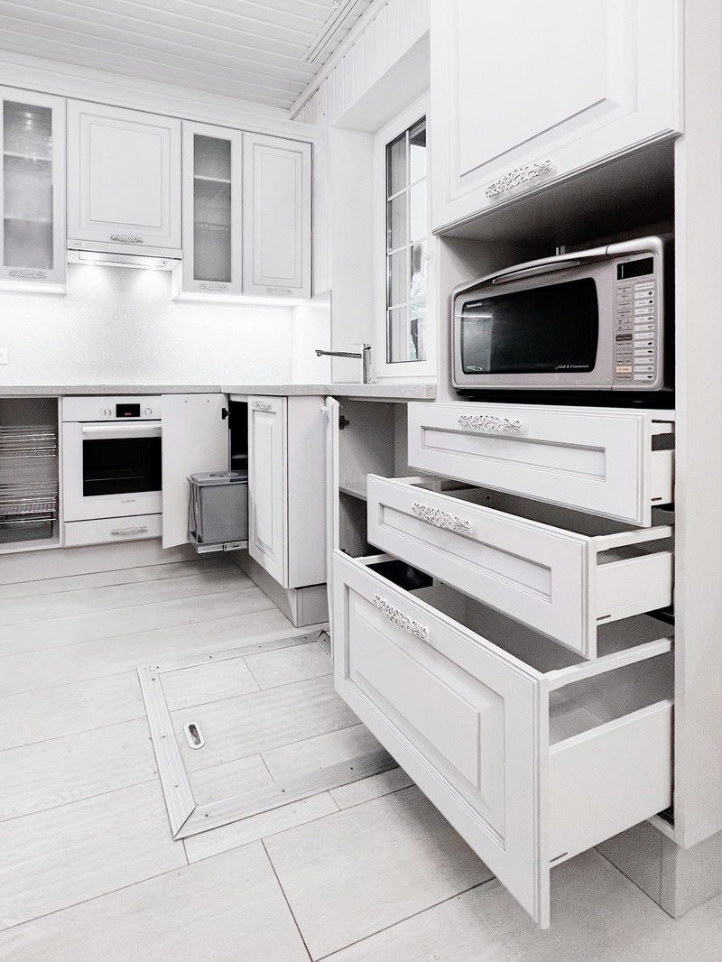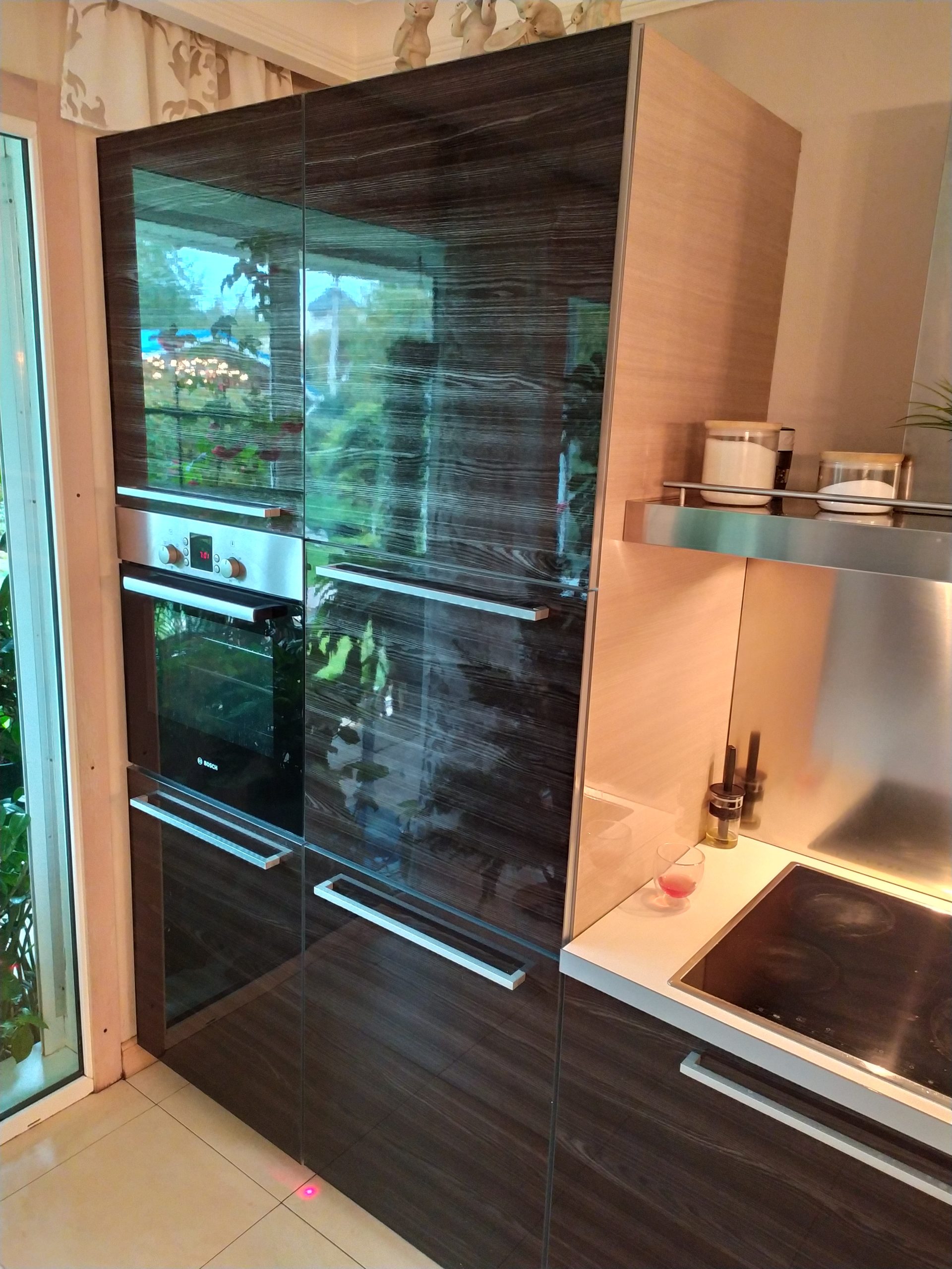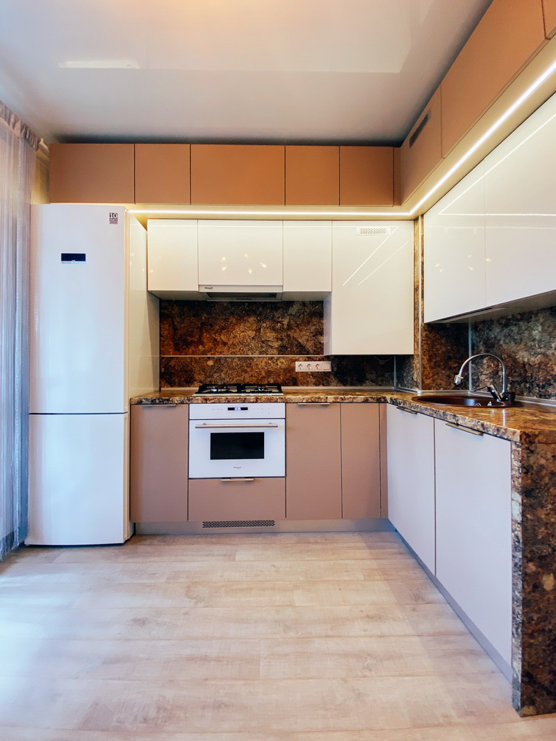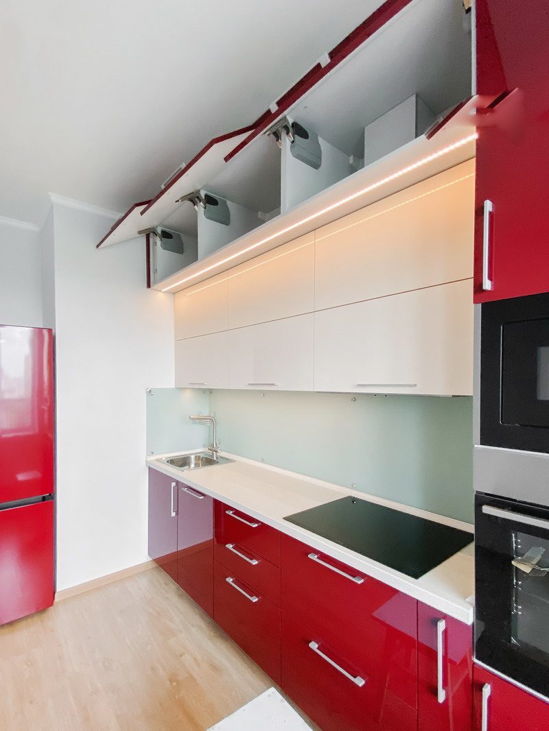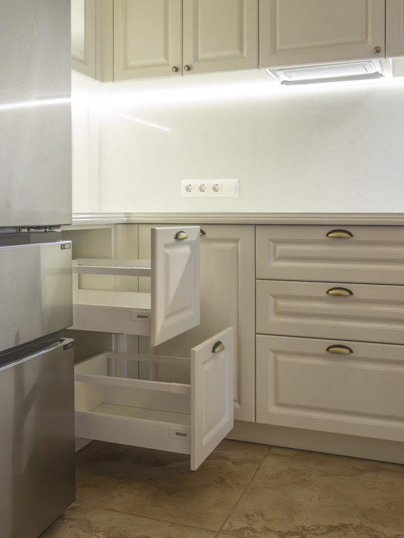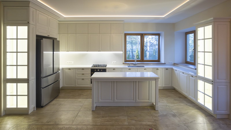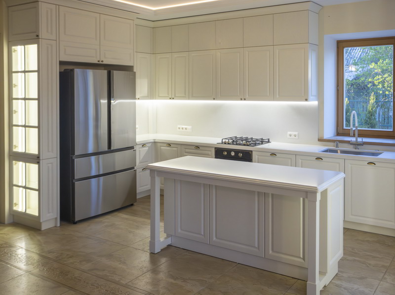В настоящее время для изготовления кухни используют материал – для корпуса ЛДСП (Ламинированная Древесно-Стружечная Плита) разного формата и толщины, например: 16, 22, 25 мм. Так же возможны комбинации по сращиванию разных толщин и облицовка торца изделия кромкой от 0,4 до 2 мм. Для корпуса кухни в основном используют материал 16 мм. На фасады кухни применяют различный материал – это могут быть как МДФ покрытое пленкой или шпоном натурального дерева 0,2 мм – используют как для фасадов в классическом стиле (различных форм фрезеровки) так и фасадов для кухонь в современном стиле используя глянцевое и матовое покрытие. Далее алюминий, пластик, стекло матовое и стеснением различных рисунков, тонированное и бесцветное. И конечно фасады из массива различных пород дерева, разной тонировки, эффектами старения. Плюс ко всему грамотно подобранная фурнитура по стилю и функциональности, завершает полную картину Вашей мечты.