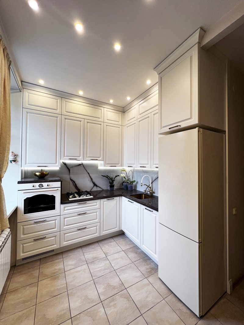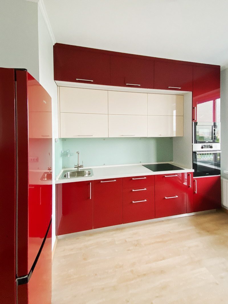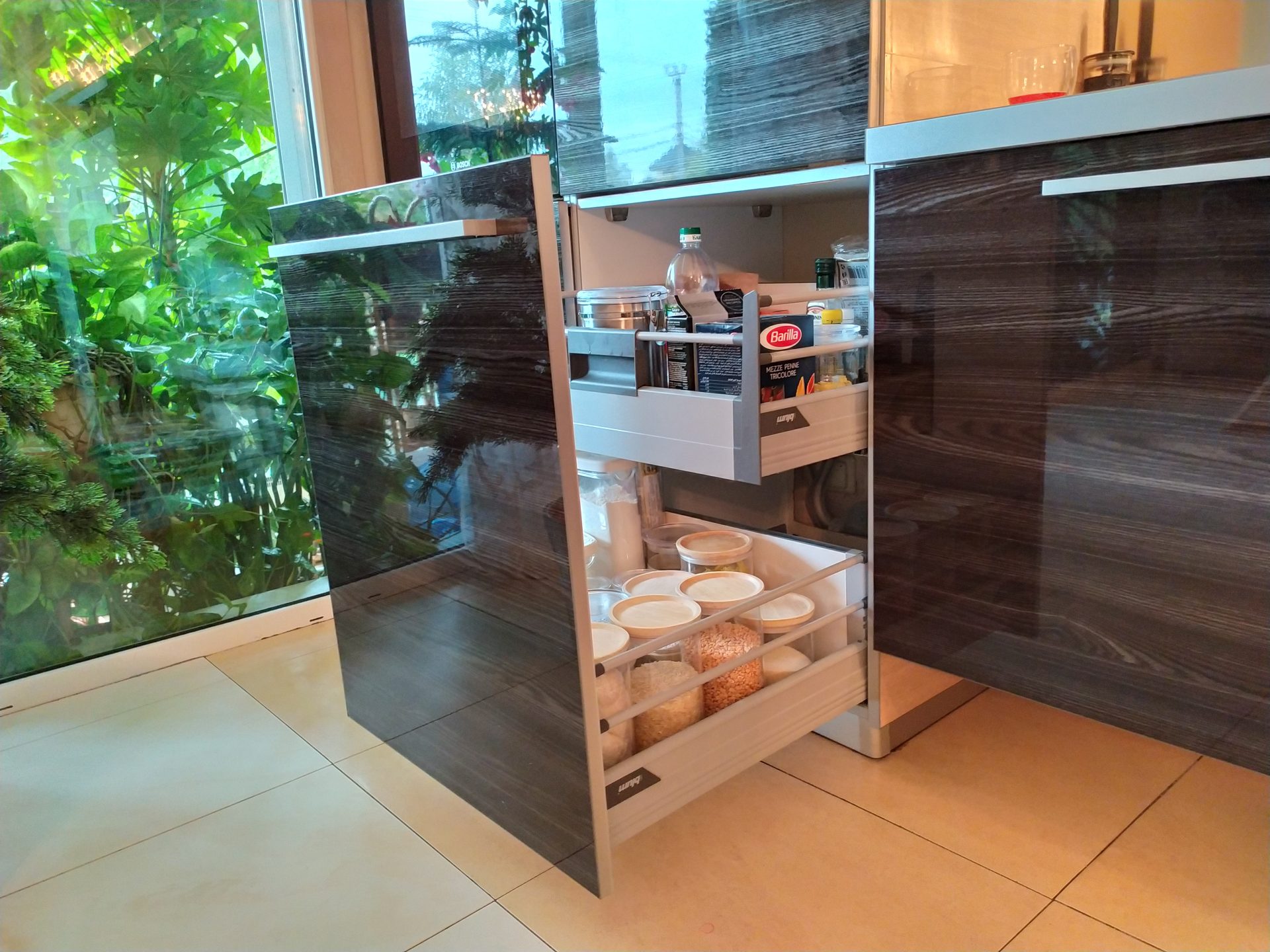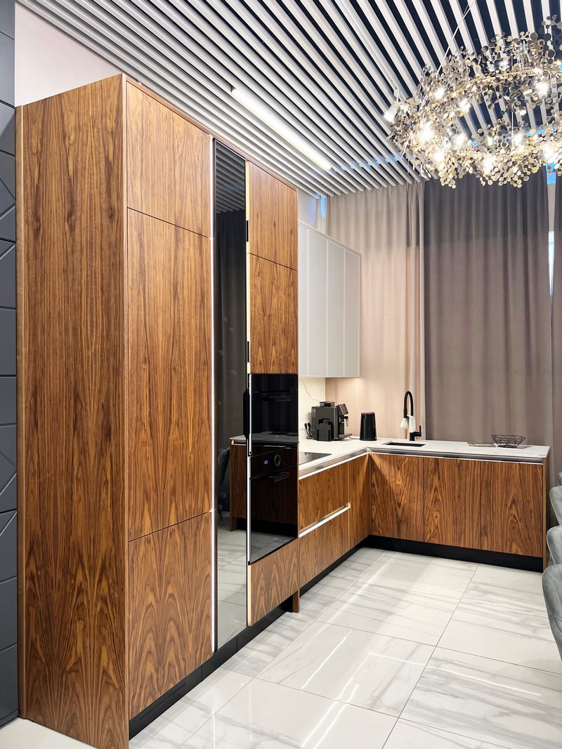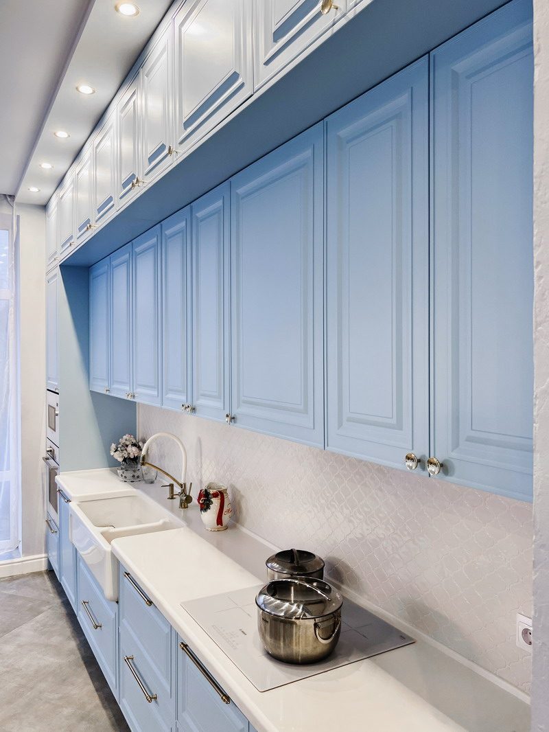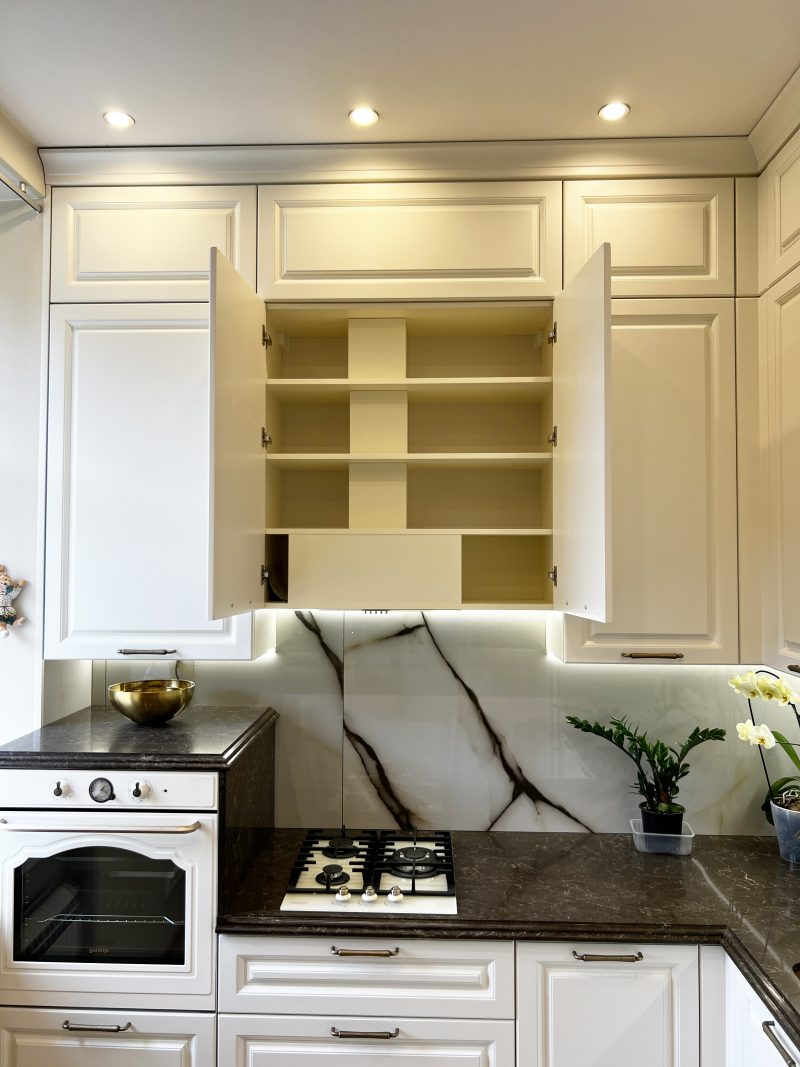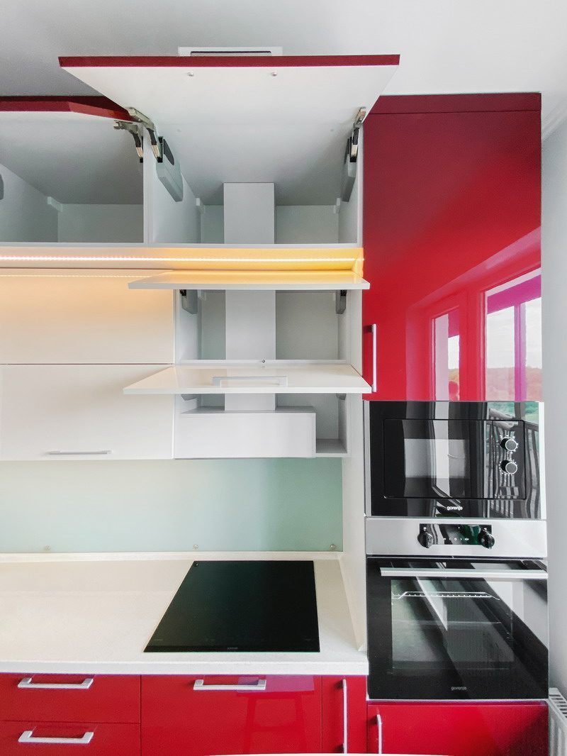 В настоящее время для изготовления кухни используют материал – для корпуса ЛДСП (Ламинированная Древесно-Стружечная Плита) разного формата и толщины, например: 16, 22, 25 мм. Так же возможны комбинации по сращиванию разных толщин и облицовка торца изделия кромкой от 0,4 до 2 мм. Для корпуса кухни в основном используют материал 16 мм. На фасады кухни применяют различный материал – это могут быть как МДФ покрытое пленкой или шпоном натурального дерева 0,2 мм – используют как для фасадов в классическом стиле (различных форм фрезеровки) так и фасадов для кухонь в современном стиле используя глянцевое и матовое покрытие. Далее алюминий, пластик, стекло матовое и стеснением различных рисунков, тонированное и бесцветное. И конечно фасады из массива различных пород дерева, разной тонировки, эффектами старения. Плюс ко всему грамотно подобранная фурнитура по стилю и функциональности, завершает полную картину Вашей мечты.