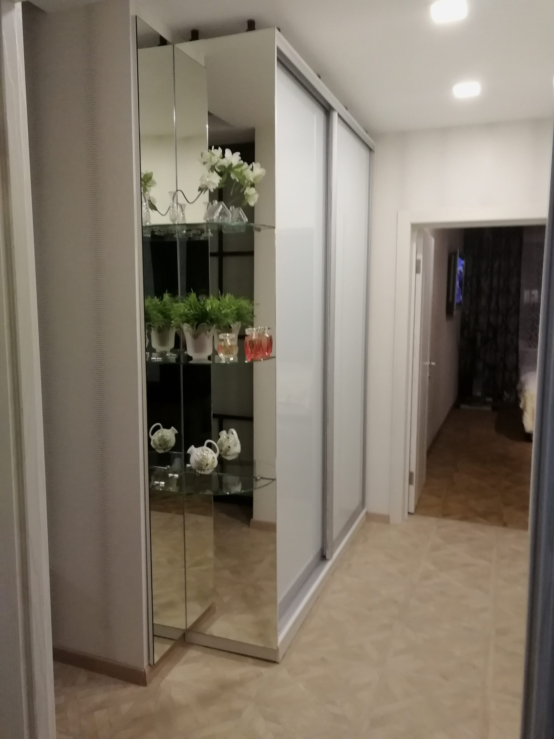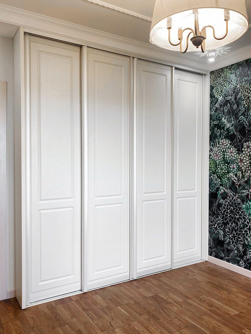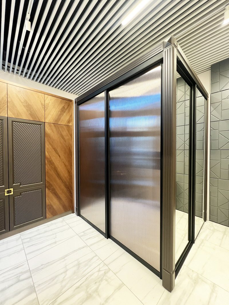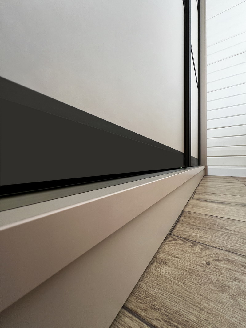 Для межкомнатных раздвижных перегородок можно использовать и двери-купе (2 рельса: верхний и нижний), и подвесные двери (1 рельс: только верхний). Лиговмебель использует в работе оба варианта механизмов, всё зависит от Вашего выбора и конструктивных особенностей помещения. Что касается стекла, то оно должно быть защищено, в целях безопасности, обязательно. Обеспечивается это, например, наклеиванием специальной плёнки на обратную сторону стекла. Плёнка может быть совершенно прозрачной и незаметной, а также матовой или многих других расцветок.