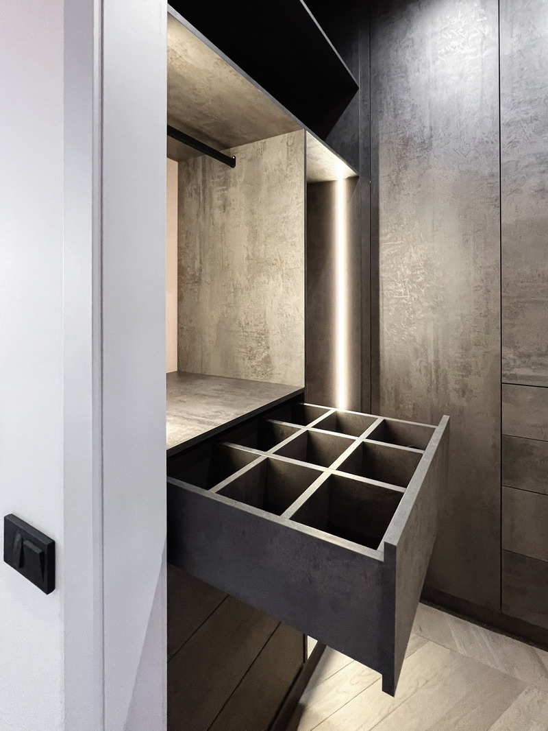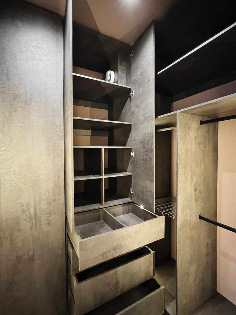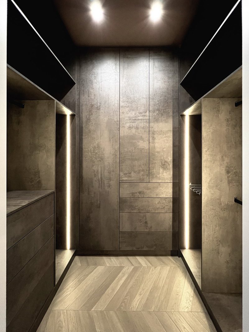 Гардеробная комната сегодня — это не просто склад вещей, а пространство с сильным характером. Проект на фото демонстрирует, как суровые индустриальные фактуры и мастерская работа со светом могут превратить зону хранения в настоящий арт-объект.